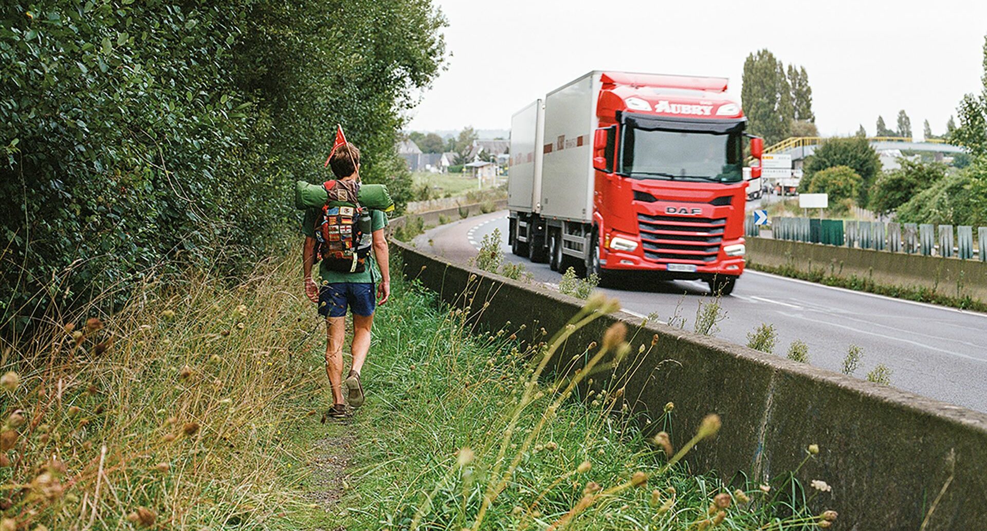 Le voyage s’est rythmé de haltes. Ici, un abribus sert de véranda provisoire pour un repas de pain, de légumes en bocal et de chocolat ; là une aire de repos devient un véritable amphithéâtre où défilent les routiers, les familles et les silhouettes anonymes qui font vibrer la route. Les toilettes, les tables de pique-nique, les poubelles ou les points d’eau deviennent des personnages secondaires, des compagnons du quotidien.