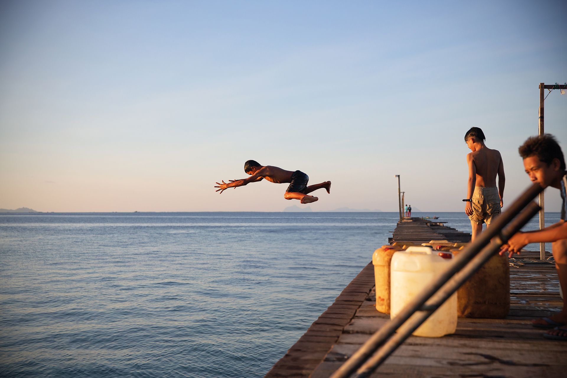 Notre embarcation file vers l’île, poussée par un gros moteur qui détonne avec la coquille de noix dans laquelle nous sommes assis. Les maisons délabrées en tôle grossissent rapidement dans l’objectif de mon appareil photo. Bientôt, le bateau bifurque pour laisser ces constructions disparaître sur notre gauche puis derrière nous. Nous contournons une anse et il nous débarque un peu plus loin, à une centaine de mètres du ponton du resort, entre deux maisons de pêcheurs. Avant même que nous ayons pu échanger le moindre renseignement avec notre marin pour organiser le retour, son bateau était reparti.