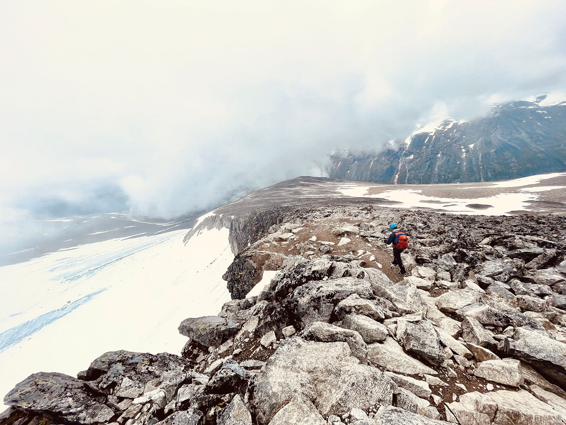 Jotunheimen signifie « maison des géants ». Un mot au carrefour de la mythologie et de la géologie. Dans le mythe scandinave, Odin, le père des dieux, accorde un territoire de glace aux jötnar (aux géants). Le Jötunheim devient alors le pays de ce peuple et l’un des neuf mondes portés par l’arbre cosmique. Au milieu du parc où nous avançons, les géants, ce sont les montagnes. Car le Jotunheimen concentre les dix plus hauts sommets du territoire, culminant à plus de 2 000 mètres d’altitude, dont le toit de la Norvège : le Galdhøpiggen. Et c’est pour cette raison que nous sommes là, nous confronter à quelque chose de plus grand que nous.