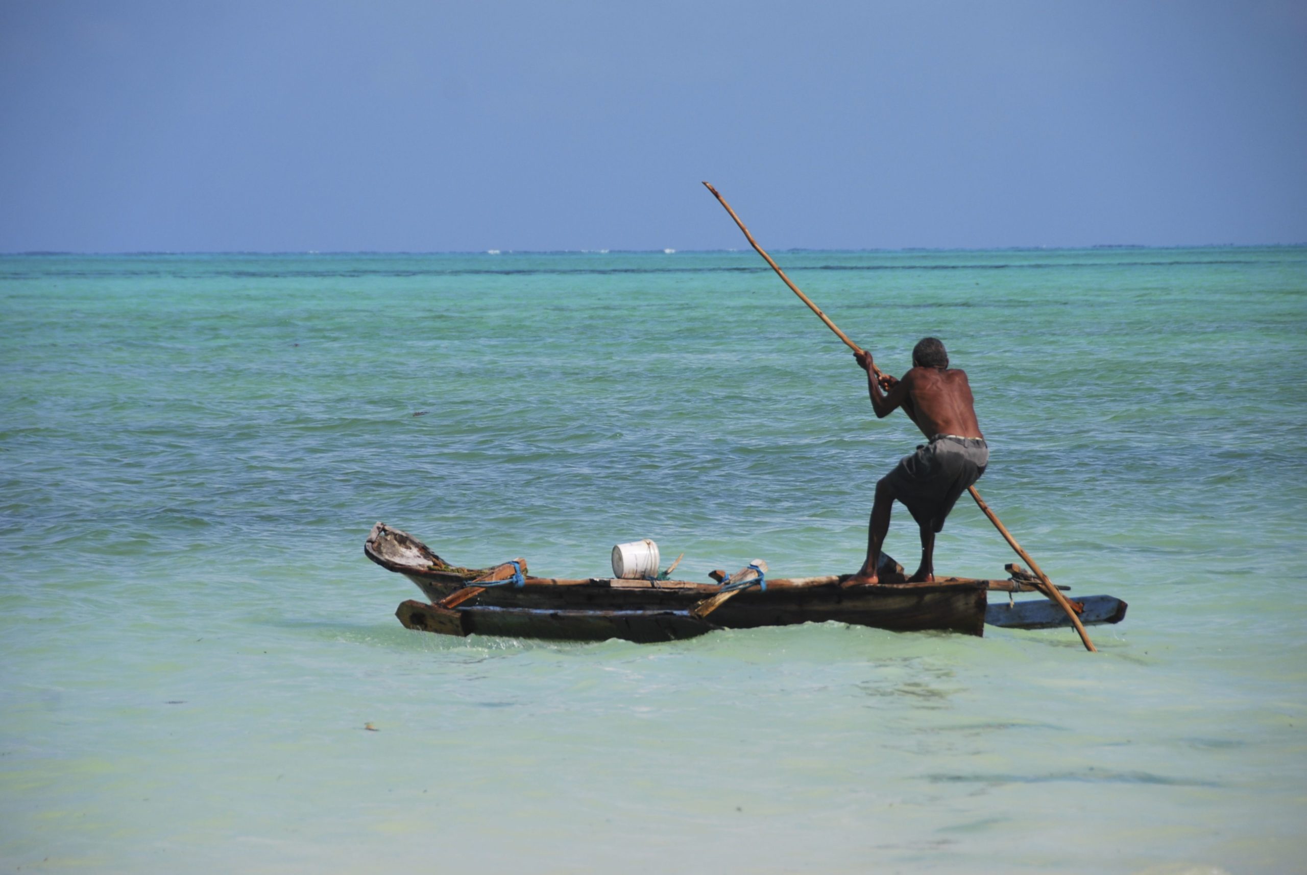 Et par miracle, une pirogue -la seule des environs!!- est justement stationnée au bord de l’immensité bleue. Attiré par mes quatre mots de kiswahali, un pécheur finit par se montrer, glisse mon vélo à l’avant et hisse les voiles pour franchir la baie et me débarquer en plein marché coloré à Chwaka.