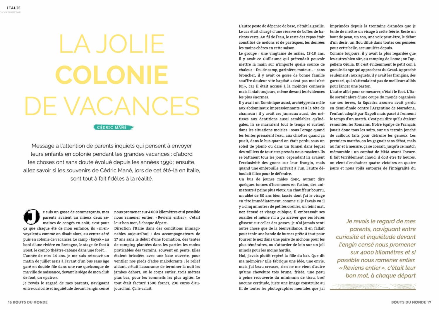 J’ai le souvenir vague d’une Simca sur le toit de laquelle étaient chargés les sacs en toile de jute d’une grosse tente Trigano, une table de camping et des chaises. Des tendeurs de vélo fixaient le chargement et c’était parti ! Le départ se faisait à deux heures du matin, parce que traverser la France par les routes nationales prenait l’allure d’une longue transhumance. On poursuivrait la nuit affalés sur les duvets placés entre les deux sièges de derrière. On se réveillait le lendemain matin et le paysage avait changé. Du haut de mes 8 ans, j’avais découvert le voyage. C’était certain, un jour viendrait où j’irais voir par-delà les montagnes.